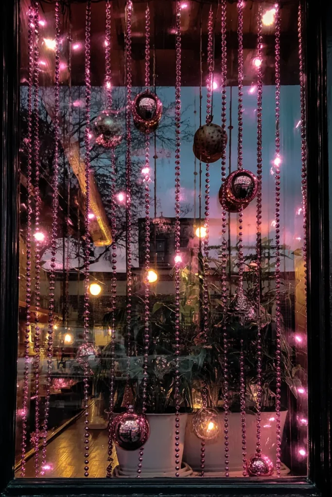 This window display gives off total Y2K glam energy with its curtain of pink beads and glossy ornaments catching the glow of twinkle lights. The reflection of the lights and the view outside blend together to create that dreamy mix of sparkle and coziness. The metallic pink tones and strands of beads feel like a nod to early-2000s fashion, turning a simple window into a statement piece that lights up the night in the prettiest way.