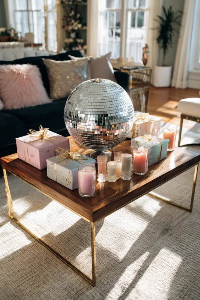 This setup takes Christmas sparkle to a whole new level with a fabulous disco ball as the centerpiece. The mirrored surface reflects soft sunlight across the room, while pastel-wrapped gifts and glowing candles fill the table with color and warmth. The gold accents on the table legs and gift ribbons tie the look together perfectly, giving the space that retro Y2K glam feel that’s both festive and chic. It’s playful, glitzy, and full of personality.