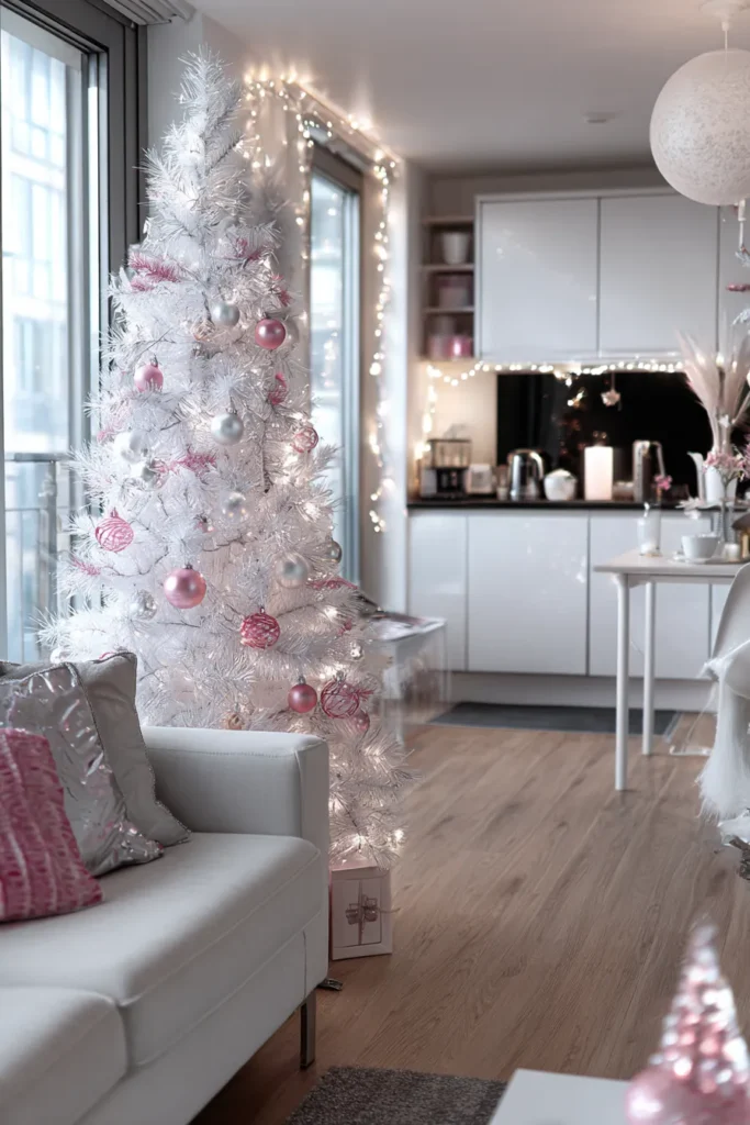 This space is serving up a totally sweet and slightly sassy holiday look with its crisp white furniture and walls contrasted beautifully with pops of soft pink and shimmering silver on the Christmas tree. The white flock or tinsel tree, decked out in glossy pink and frosted silver baubles and twinkling fairy lights, stands right next to a huge window, making the whole room feel bright and airy even with the cozy glow. Seriously, the modern, streamlined white kitchen in the background keeps everything feeling super clean and chic, so this festive decor just reads as effortlessly stylish rather than cluttered.