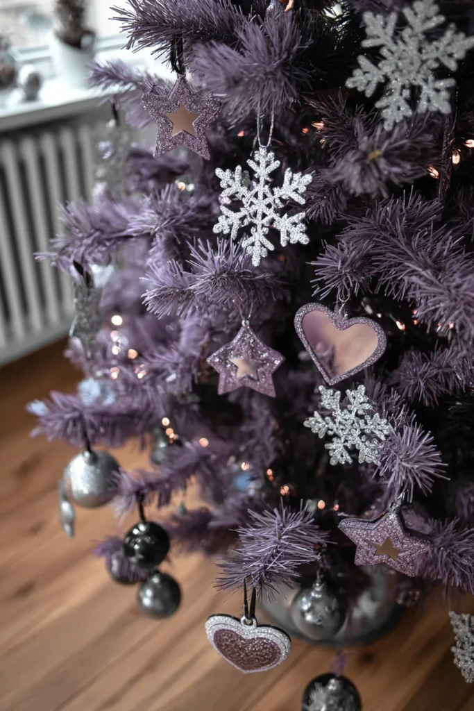 Get ready to feel transported because this Christmas tree is giving us major early 2000s nostalgia with its gorgeous deep purple foliage, which is definitely not your grandma’s green fir. It’s styled to perfection with chunky silver snowflakes, glittery purple stars, and heart-shaped ornaments that have a subtle sparkle and a delicate patterned center. The mix of deep, moody purple branches with the bright, cool-toned silver and dusty lavender decorations creates a look that is both dark and glamorous, all grounded by that warm wooden floor beneath.