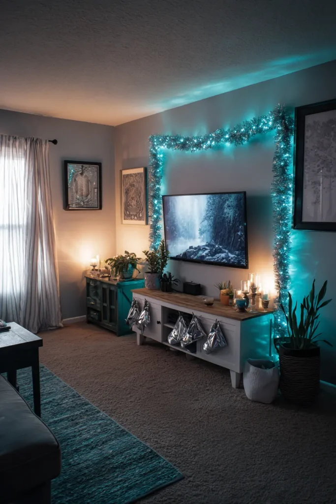 This living area screams cool, slightly moody holiday vibes by swapping traditional reds and greens for an electric cyan glow that totally channels that early 2000s techno aesthetic. The TV wall is the absolute star here, framed by thick silver tinsel wrapped in vibrant blue lights that cast a futuristic hue across the room. We see a mix of natural textures like the wood-topped console and shaggy carpet, but the modern touches come from the metallic silver stockings hanging just so, keeping the whole scene feeling current despite the playful lighting choice.
