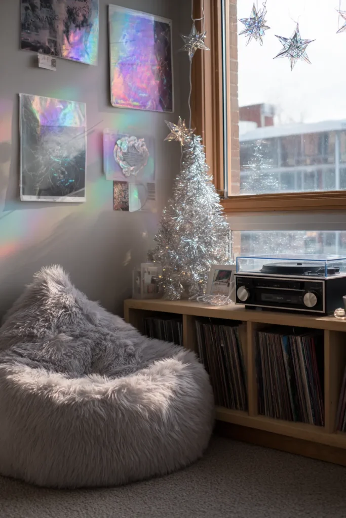 This corner setup is pure nostalgic bliss, blending ultra-soft textures with futuristic, light-catching metallics that scream Y2K style. The centerpiece is a ridiculously fluffy, light gray beanbag chair that looks like the perfect place to hibernate through winter. Above it, the wall is decorated with several holographic prints catching the sunlight to create gorgeous rainbow streaks across the gray wall, while a tiny silver tinsel tree and star-shaped window ornaments echo the shimmer. Plus, you spot a record player nestled in a wooden shelf filled with vinyl, confirming this is a space for chilling out and vibing.