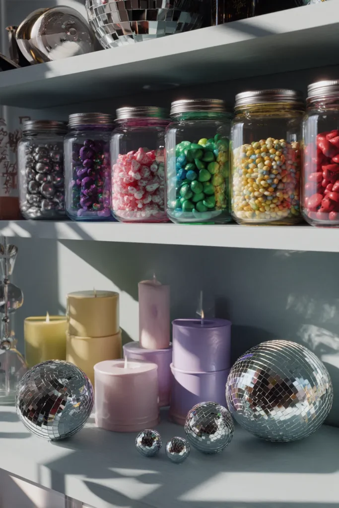 This styling vignette is all about maximalist fun centered around shine and sweet pastels, perfectly capturing that playful spirit we love. We have chunky pillar candles stacked up in soft shades of pale yellow, blush pink, and light lavender creating a dreamy, low glow effect. Above this subtle color palette, the top shelf is packed with clear jars filled with brightly colored, shiny candies or decorative stones in silver, purple, pink, turquoise, yellow, and red, all lined up like a rainbow candy shop. The entire scene is punctuated by dazzling disco balls of various sizes resting on the shelf below, ready to scatter light everywhere.