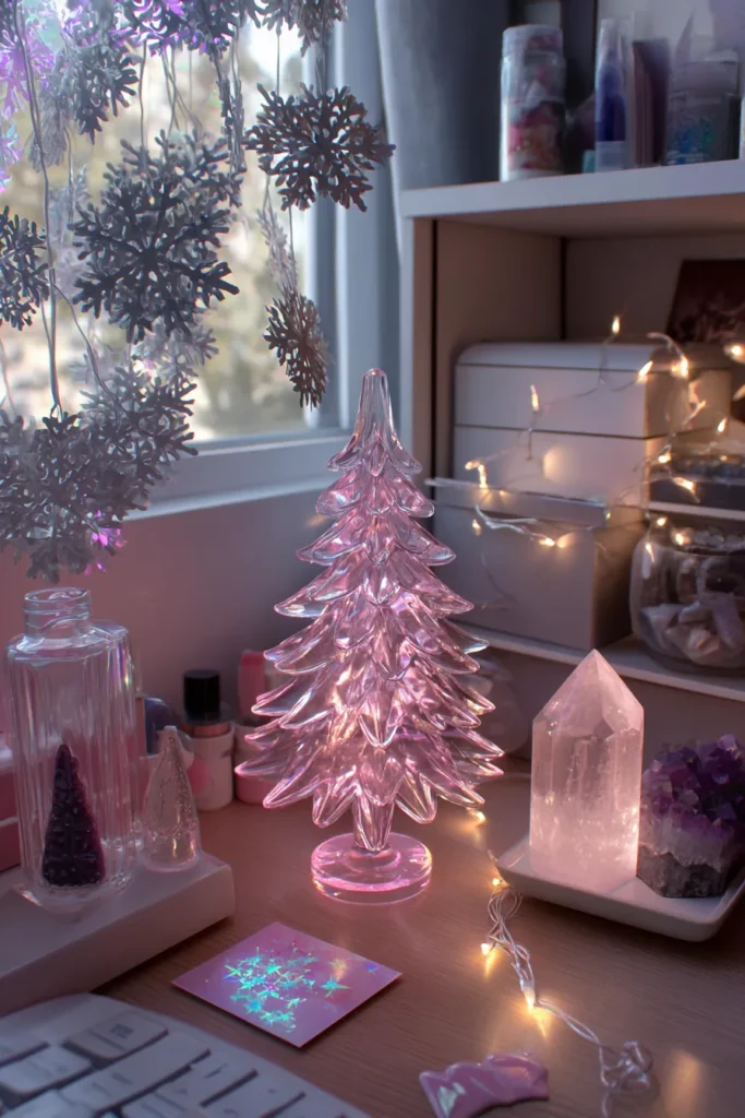 This little desk corner is channeling serious ethereal, wintery magic with its heavy use of translucent and iridescent materials bathed in a soft pink glow. The star of the show is a stunning, sculpted acrylic Christmas tree in a rosy hue that lights up from within, surrounded by natural crystal points like quartz and amethyst that catch the light beautifully. Hanging near the window are delicate, star-shaped ornaments that refract the daylight, while tiny warm fairy lights weave around the setup adding a cozy layer to the cool, sparkly aesthetic.