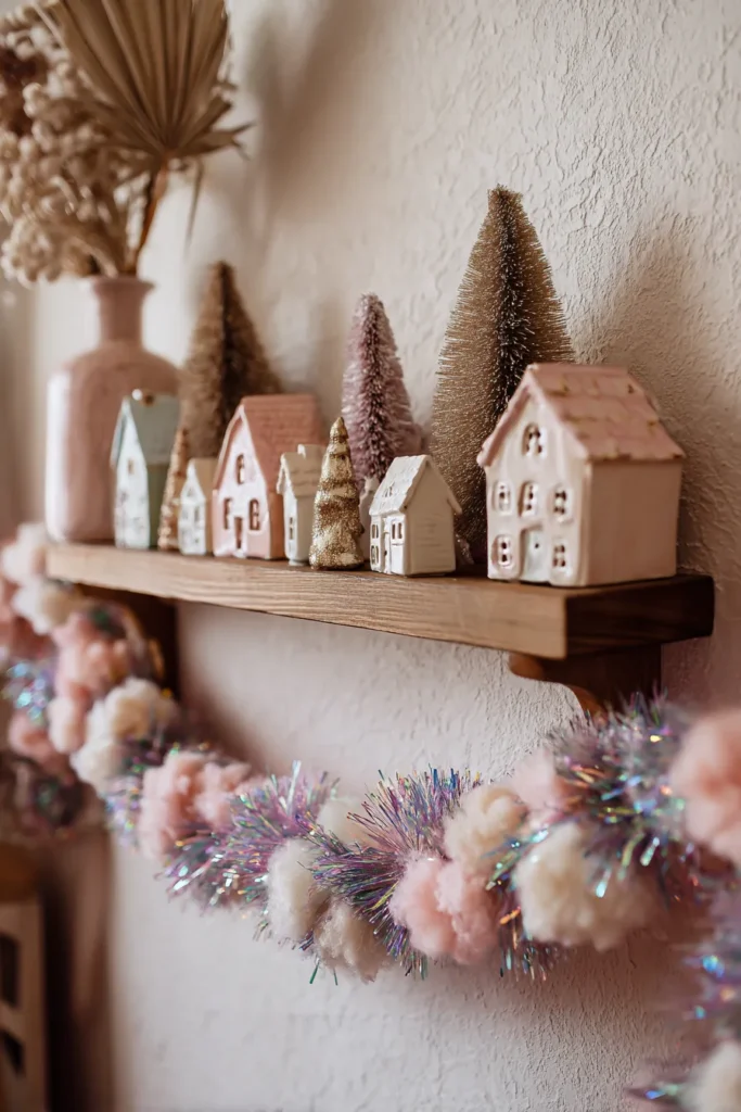 This little vignette brings to life a super sweet, almost dollhouse-like winter village set against a backdrop of soft textures and warm neutrals. The focal point is a collection of tiny ceramic houses in soft white, pale blush pink, and even a hint of seafoam green, nestled next to miniature bottle brush trees in shades of dusty brown and glittery gold. Hanging below the wooden shelf is a totally fluffy garland made of white and pink pom-poms interspersed with iridescent, shiny tinsel that reflects light playfully. Adding a touch of bohemian flair is a dried palm arrangement in a matte pink vase sitting at the end of the shelf.
