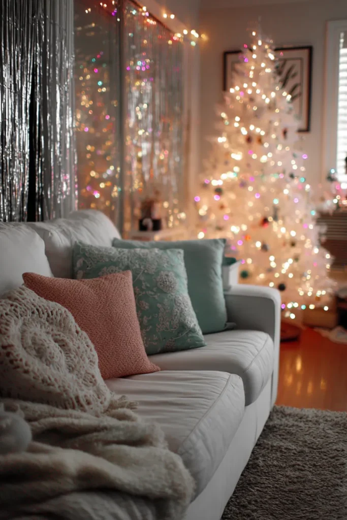 This living room nook perfectly balances cozy comfort with a playful Y2K color story that’s just so inviting for a festive movie night. The crisp white sofa is piled high with textural pillows in soft blush pink and a gorgeous muted aqua with subtle white embroidery, all topped with a chunky, cream-colored knit throw blanket. In the background, a stunning white tinsel Christmas tree is completely covered in multi-colored fairy lights that create a magical, dreamy bokeh effect, while shiny silver tinsel curtains frame the light source adding extra sparkle.