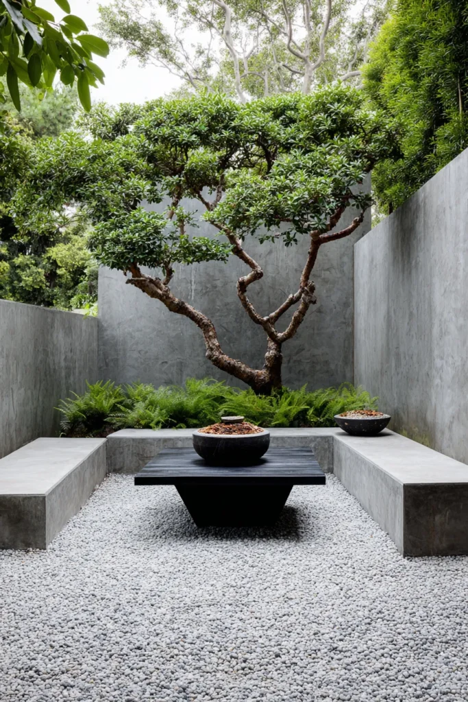 This patio design is a masterclass in minimalist serenity using raw concrete walls and seating to create an intimate courtyard feel. The space is anchored by a gorgeous mature tree with a beautifully gnarled trunk offering natural shade and a focal point against the gray backdrop. The ground is covered in light-colored crushed gravel adding to the dry garden aesthetic and contrasting beautifully with the dark, low-slung table. Simple planters sit atop the concrete benches adding small, dark accents to this incredibly pared-down yet impactful outdoor room.