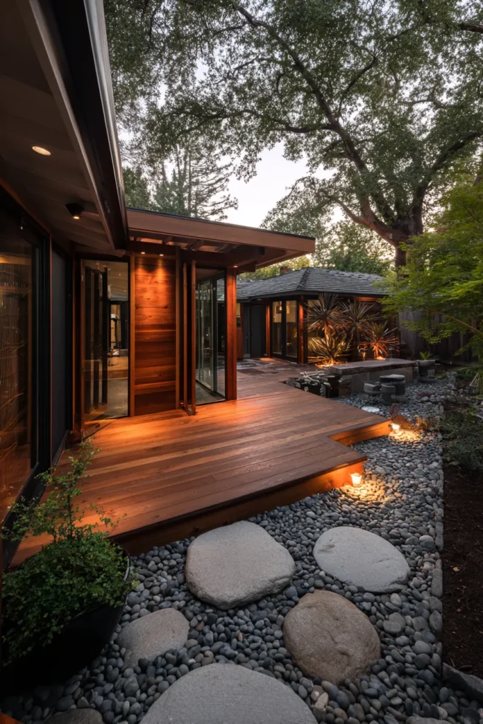 I am completely head over heels for the beautiful texture and warmth of this entrance it’s like a peaceful embrace as you walk in. The contrast between the perfectly straight, modern lines of the deck and the organic, rounded stones is so appealing and visually interesting. That little stone lantern is the perfect touch of traditional charm and it makes the entire space feel so deeply rooted and serene. It’s a gorgeous example of thoughtful design that truly elevates the experience of coming home and I absolutely adore it.