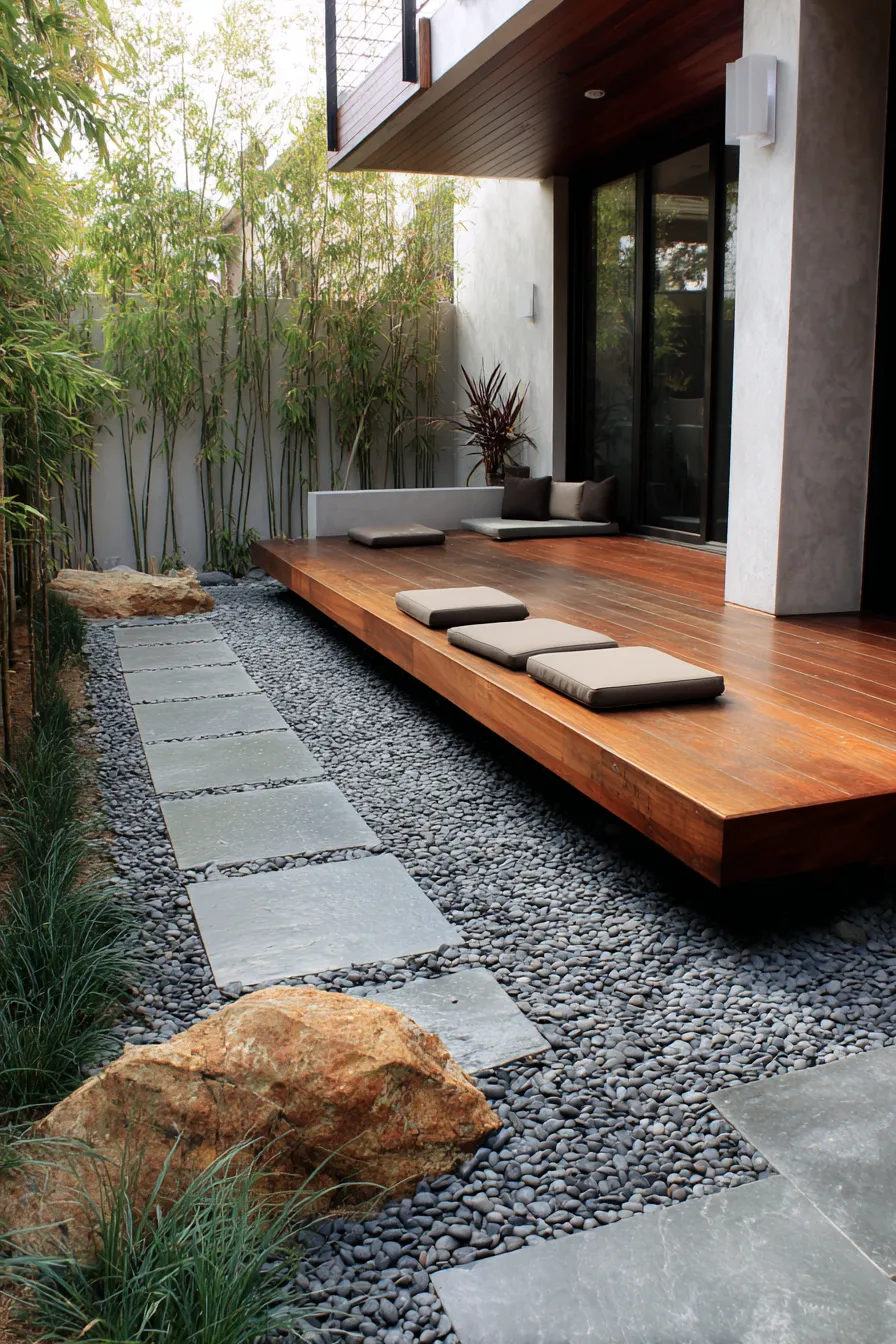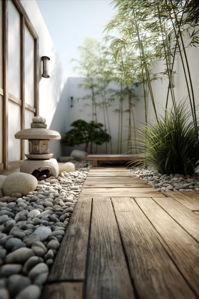 A backdrop of tall, swaying bamboo plants adds privacy and a lush green element completing this serene and harmonious garden. I am totally enamored with how effortlessly cool and peaceful this design is it’s like a warm hug for your senses. The way the wooden deck almost floats above the pebble garden is so chic and those floor cushions just beg you to kick back and unwind. I think it’s so impressive how it combines modern clean lines with such organic, natural elements creating a space that feels both stylish and incredibly grounding. This is exactly where I’d want to spend a slow afternoon reading and just soaking up the calm vibes.