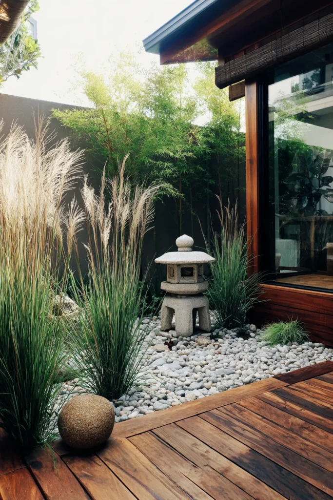 This design showcases a perfectly framed Zen patio area defined by a rich wooden deck and a stunning contrast of textures and colors. The garden bed is filled with smooth, light-colored pebbles where a traditional stone lantern sits nestled between dramatic clumps of tall, flowing ornamental grasses. The backdrop is a sleek dark wall contrasted by a living screen of vibrant green bamboo stalks adding height and incredible privacy. The deck itself is constructed of warm, beautifully aged wood planks leading right up to a large picture window of the home.