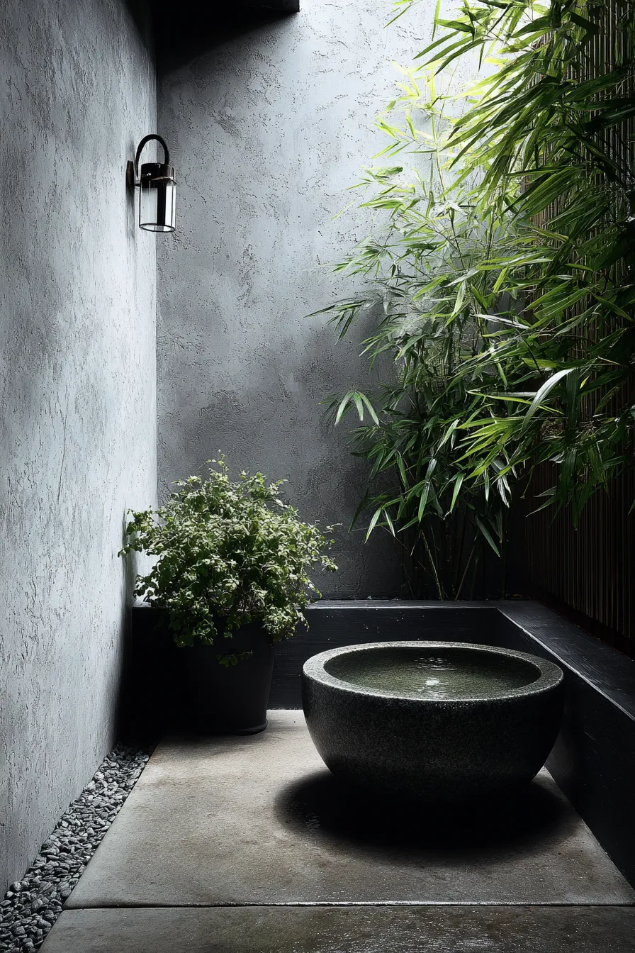 This small, intimate courtyard is a lesson in creating deep tranquility with limited space using a moody, high-contrast palette. The textured gray stucco walls create an immediately enclosed and private feeling dramatically lit by a simple outdoor lantern. A sleek, dark gray stone water basin sits on a raised black platform offering a soothing visual and sound element to the space. Tall, vibrant bamboo stalks spill down from above adding height and lush movement against the simple walls while a few dark river pebbles are scattered along the floor for texture.