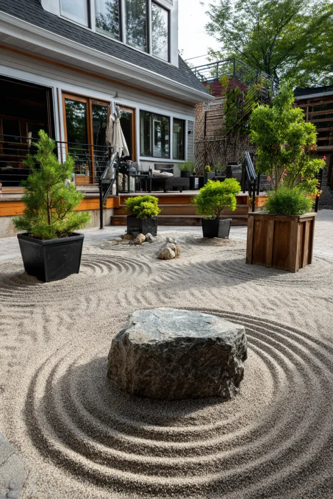 This amazing design transforms a backyard into a truly meditative landscape centered around a classic Japanese dry garden. The large area is covered in light, finely raked gravel with swirling, circular patterns expertly etched around a single, massive rectangular boulder that serves as the centerpiece. Four carefully chosen trees in dark planters are positioned to define the space while still allowing a clear view to the elevated wooden deck and outdoor lounging area. The contrast between the formal Zen garden and the casual, multi-level patio creates a sophisticated and balanced outdoor environment.