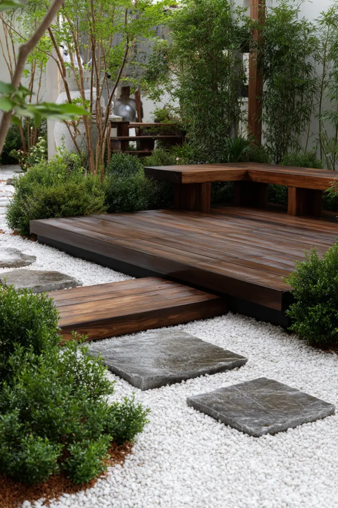 This striking design creates a beautiful flow through the garden using an elevated, rich wooden deck as a luxurious seating area that seems to float above the ground. The deck is finished with a built-in bench creating a cozy, structured corner for relaxing and is framed by lush, dark green foliage and tall bamboo. The transition from the wood is handled beautifully by large, square dark stone pavers stepping across a field of vibrant white crushed gravel. The mix of the dark wood, the bright pebbles, and the green plantings is incredibly eye-catching and soothing.