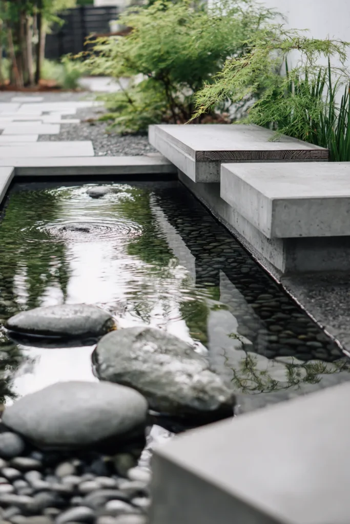 I think this design is so incredibly chic and sophisticated it’s the definition of modern Zen elegance. The way the hard lines of the concrete benches meet the gentle ripples of the water is just a visual masterpiece and it creates instant tranquility. It’s so smart how they used the smooth, natural stones in the water to break up the harsh geometry adding a soft organic touch. This space feels wonderfully clean, uncluttered, and utterly relaxing a true testament to flawless outdoor architecture.