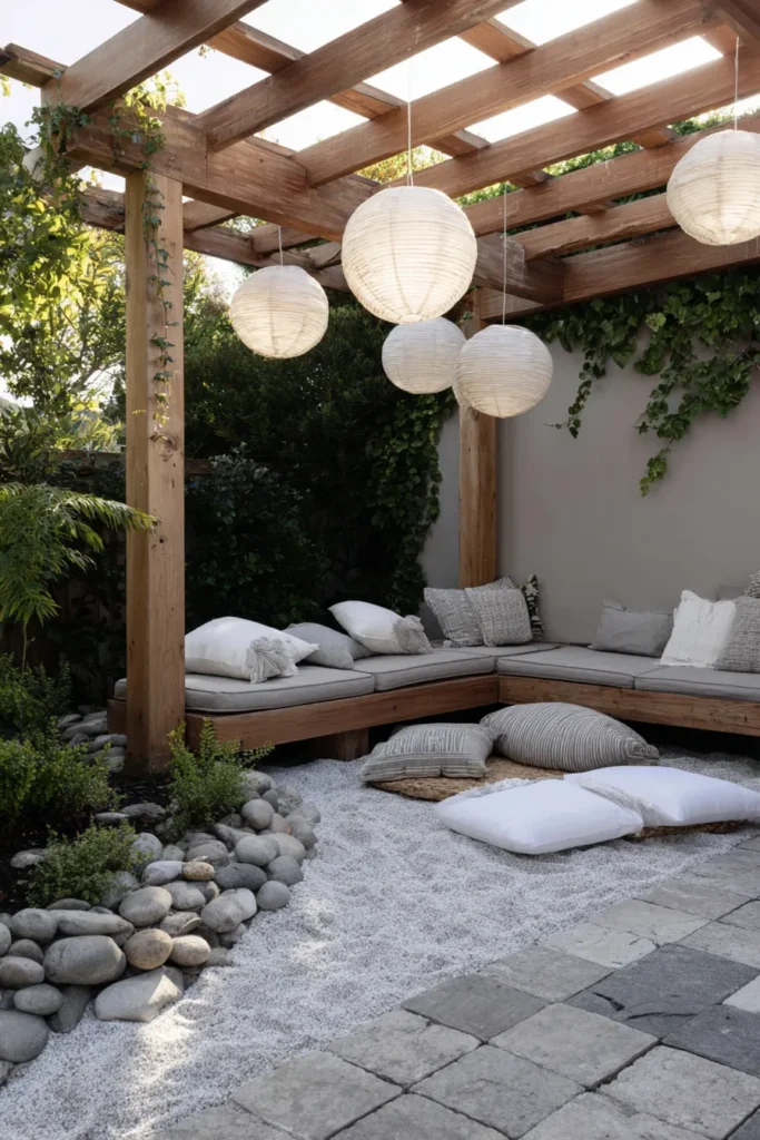 This patio is a dreamy blend of bohemian comfort and structured Zen design creating the ultimate laid-back outdoor living room. A sturdy wooden pergola with exposed rafters provides overhead structure and support for a gorgeous cluster of large, hanging white paper lanterns that add a soft, magical glow. Built-in low wooden benches with plush, neutral cushions form a cozy L-shaped lounge area inviting guests to gather and relax. The floor is a mix of square paving stones and a central area of raked white gravel bordered by smooth river stones tying the space to the Zen garden tradition.