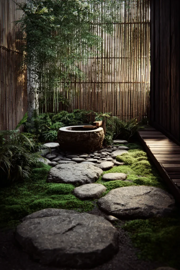I truly think this is the most romantic and magical little corner I have ever laid eyes on it’s like stepping into a peaceful fairytale. The contrast between the dark, wet-looking stones and the intense green moss is just breathtaking and the way the light filters through the bamboo is absolutely divine. This space just begs you to slow down and listen to the quiet sounds of nature and I can already imagine sitting here with my morning matcha finding total calm. It feels so authentic and deeply comforting and I adore every single detail.
