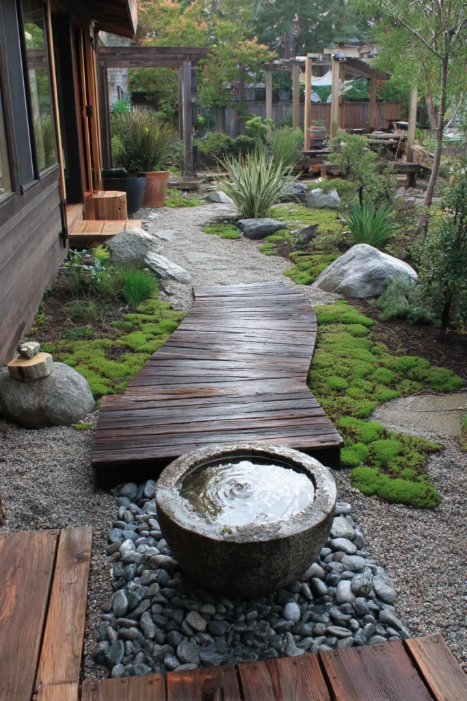 At the start of the path a gorgeous stone water basin creates a gentle focal point surrounded by smooth dark pebbles promising a soothing sound as you pass. I absolutely adore how inviting and natural this garden feels it’s like a little piece of untouched wilderness tailored for peaceful contemplation. The way the wood path is slightly damp and winding makes me want to take off my shoes and really feel the different textures underfoot. It’s not overly manicured but every element feels thoughtfully placed creating a harmonious blend that just feels right. This is the kind of garden that truly nourishes the soul and I think it’s just perfect.