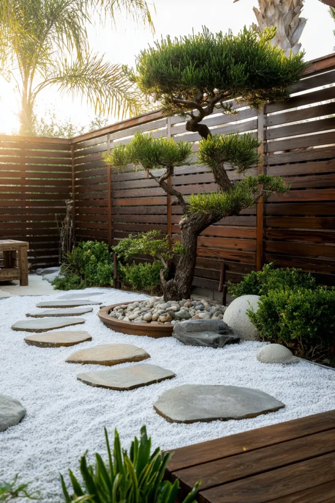 The ground is covered in immaculate white gravel creating a stunning contrast with the large flat stepping stones that guide you through the garden. At the heart of it all is a magnificent shaped bonsai tree its sculptural form acting as a living piece of art nestled among smooth river stones and low-lying shrubs. What I find truly spectacular about this design is the incredible way it blends simplicity with such powerful visual impact. The crisp white gravel makes everything pop especially that incredible bonsai tree which is a showstopper in itself. It feels so clean and organized but still incredibly warm thanks to all that gorgeous wood and the dappled sunlight. This is a space that encourages you to breathe deeply and just be and I think it’s an absolutely stunning example of thoughtful outdoor design.