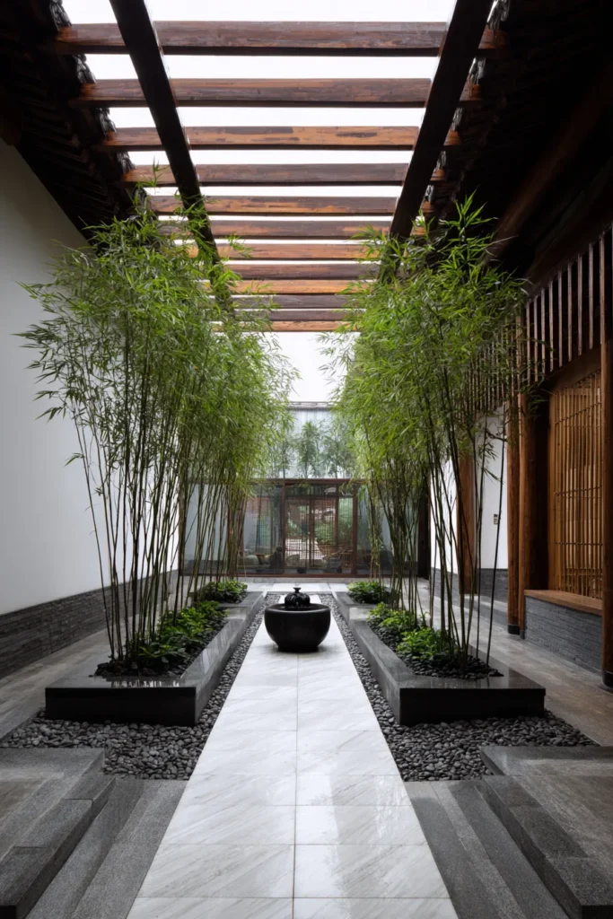 Overhead a beautiful slatted wooden pergola allows light to filter through creating an interplay of shadow and light that feels incredibly inviting and peaceful. I honestly think this entryway is absolutely breathtaking it feels like stepping into a sacred tranquil space every single time. The way the bamboo creates such an immersive and calming experience is pure genius and I can just imagine the gentle rustle of the leaves in a soft breeze. It’s so elegant and perfectly balanced feeling both modern and deeply rooted in tradition. This design isn’t just a path it’s a journey into calm and I am completely in love with its refined beauty.