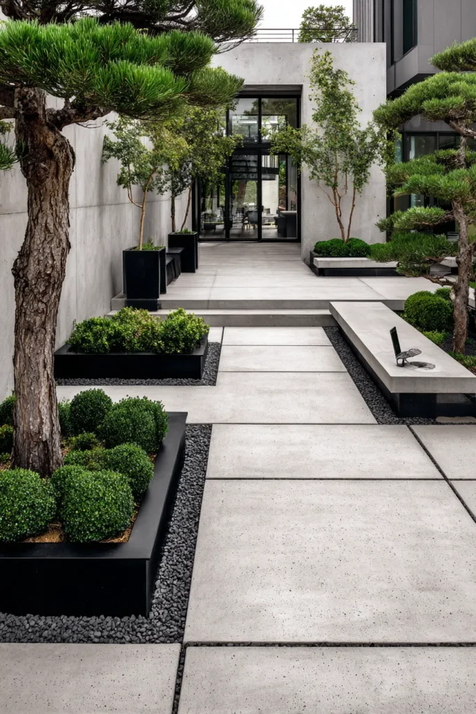 The use of dark river pebbles around the planters and patio edges adds texture and enhances the visual contrast of the space. I am completely obsessed with the graphic impact of this design it’s so effortlessly chic and contemporary. The strong contrast between the cool gray concrete and the crisp, dark black planters with that vibrant green foliage is just perfection. It feels like a high-fashion garden editorial and I think the designers totally nailed the balance of hard materials and soft, organic shapes. It’s a perfect example of how simplicity can be the ultimate form of luxury and I find it so inspiring.