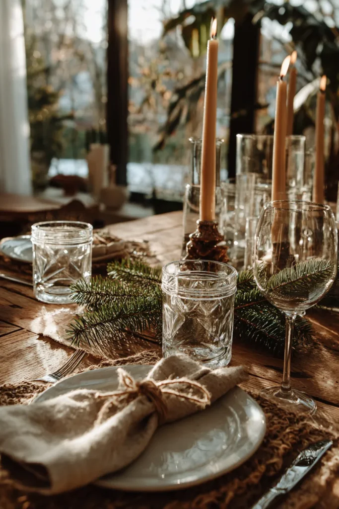 This tablescape exudes a deeply warm and inviting atmosphere, perfect for a mindful, slow-paced holiday gathering that emphasizes natural beauty. The setting rests on a heavily textured, warm wood table, layered with a woven burlap-like runner. Each place setting features a simple ceramic plate topped with a linen napkin neatly tied with natural twine, echoing the organic feel of the small sprigs of fresh pine and clear glass jars used as drinking vessels. Tall, slim taper candles in a soft tan or blush color cast a beautiful, golden glow across the scene, suggesting a cozy evening meal.
