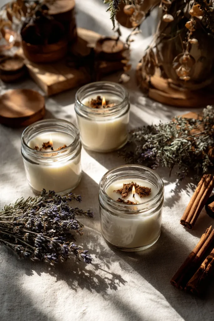 Picture this cozy scene setting the perfect tone for a sustainable holiday season. We have three lovely scented candles glowing softly in classic glass jars creating a warm ambiance on a light linen tablecloth. The wax looks creamy and inviting with a sprinkle of something warm and earthy like ground cinnamon or coffee adorning the top around the little flickering flame. Scattered around these little beacons of light are beautiful bundles of dried lavender providing a gentle visual texture and perhaps a hint of calming aroma alongside some rustic cinnamon sticks ready to infuse kitchens or living rooms with festive spice. In the background soft-focus wooden elements add grounding natural tones making the whole setup feel incredibly organic and connected to nature.