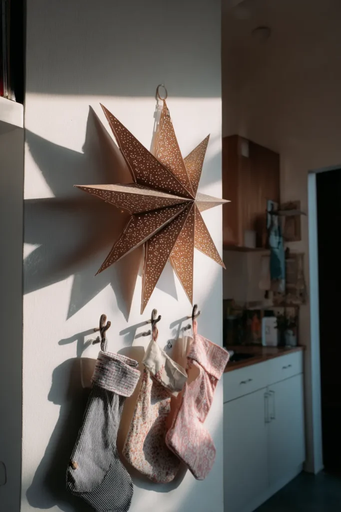 This little nook perfectly captures a charming, homemade holiday feeling with a focus on simple, reusable decorations. Above a row of small hooks, a large, geometric star lantern made of perforated brown paper serves as the central decor piece, casting intricate shadows on the white wall. Hanging below are three adorable Christmas stockings, each crafted from different charming fabrics like muted stripes and soft floral prints, suggesting they are handmade and meant to be cherished year after year. The entire display benefits from a strong beam of natural sunlight that highlights the textures and shadows beautifully.