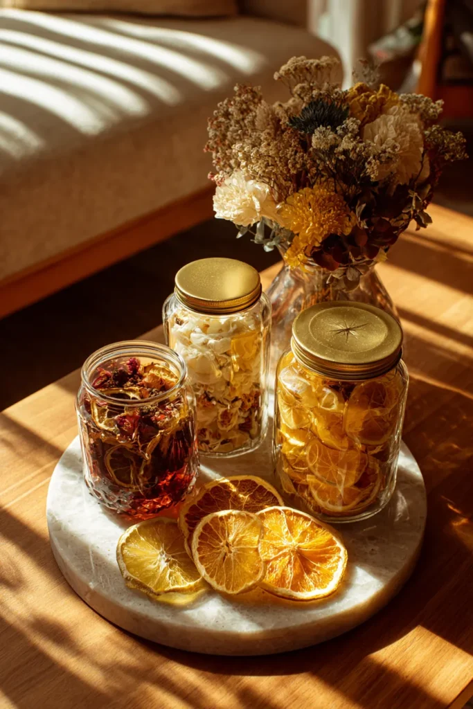 I mean come on this is just the prettiest way to use up those leftover citrus peels and dried flowers from summer. The way the light hits those glass jars making the oranges practically shimmer is just breathtaking it feels so sunny and hopeful even on a grey winter day. I think keeping ingredients like this on display is such a smart zero-waste hack because it’s functional storage and absolutely stunning home decor all rolled into one. I really want to recreate this whole setup for my own coffee table I just love how cheerful and earthy it looks.