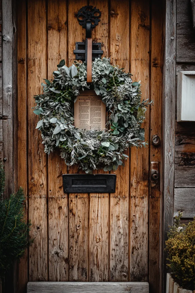 This front door decor is pure storybook charm featuring a stunningly textured wooden door as its backdrop. A lush, asymmetrical wreath hangs proudly, crafted from gorgeous dusty green foliage like silvery eucalyptus and perhaps some pale sage. Instead of a traditional bow or decoration in the center, there’s a piece of aged paper that looks like an excerpt from an old book or perhaps even a vintage hymn, adding such a unique and meaningful focal point. The door itself boasts rich vertical wood grain and classic black hardware including a sturdy letterbox slot and a decorative door knocker adding to that rustic, welcoming feel. Some simple greenery in pots flanks the bottom, completing the natural aesthetic.